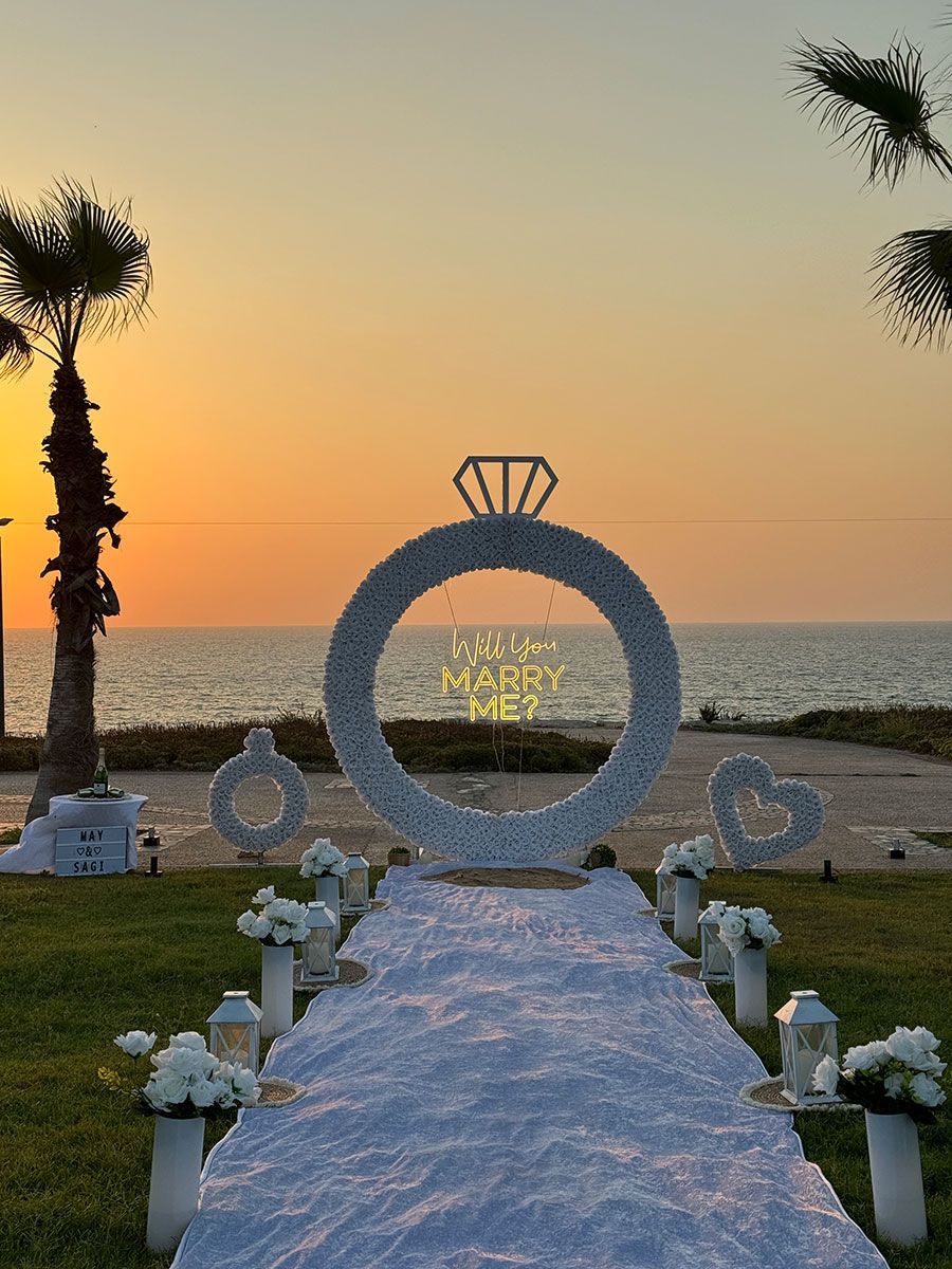 כדי להפוך את ההצעה למרשימה ומותאמת בדיוק לכם, אנו דואגים לתפאורה ייחודית שתשדרג את האווירה הטבעית של החוף. זה יכול לכלול הרבה דברים כמו כול מיני עיצובים שונים אם שולחן עם פרחים ונרות דולקים, וכמובן תאורה עדינה שתאיר את המקום לאחר השקיעה. בנוסף, ניתן לשלב אלמנטים מותאמים אישית כמו השמות של הזוג פרחים אמתיים ועוד.
